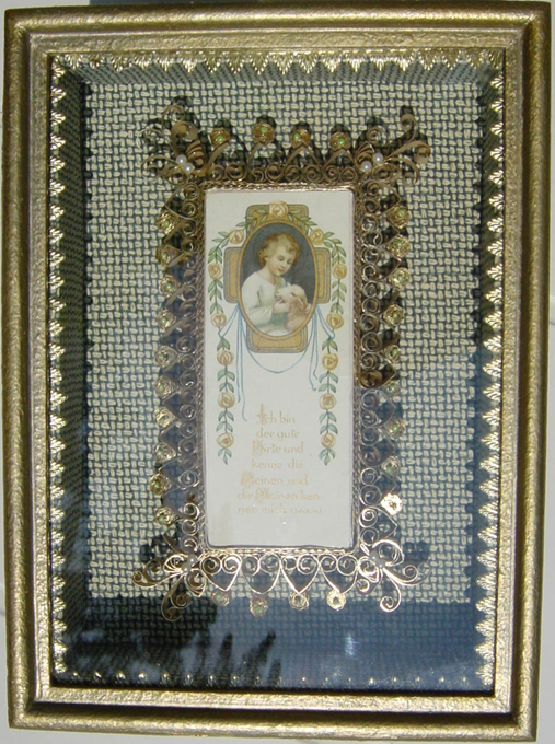 Krüllarbeit mit altem Heiligenbild.